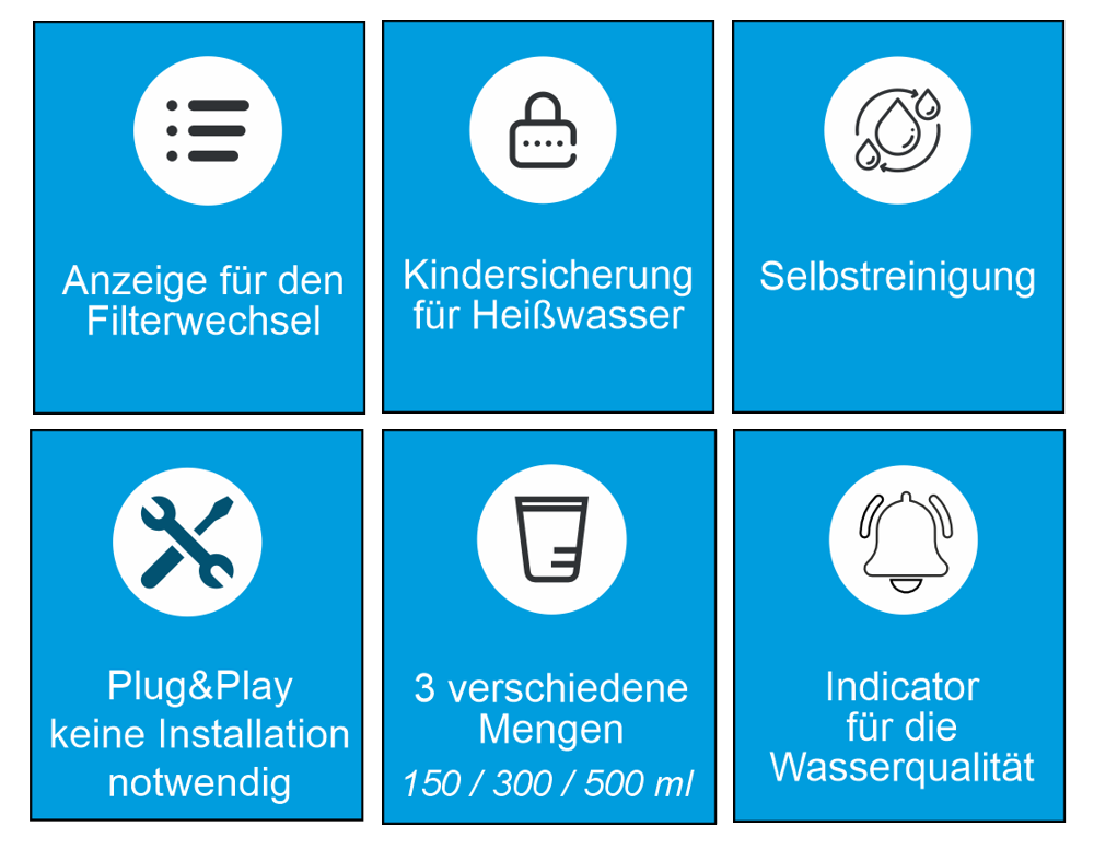 - Wassermengenwahl (150 / 300 / 500 ml)