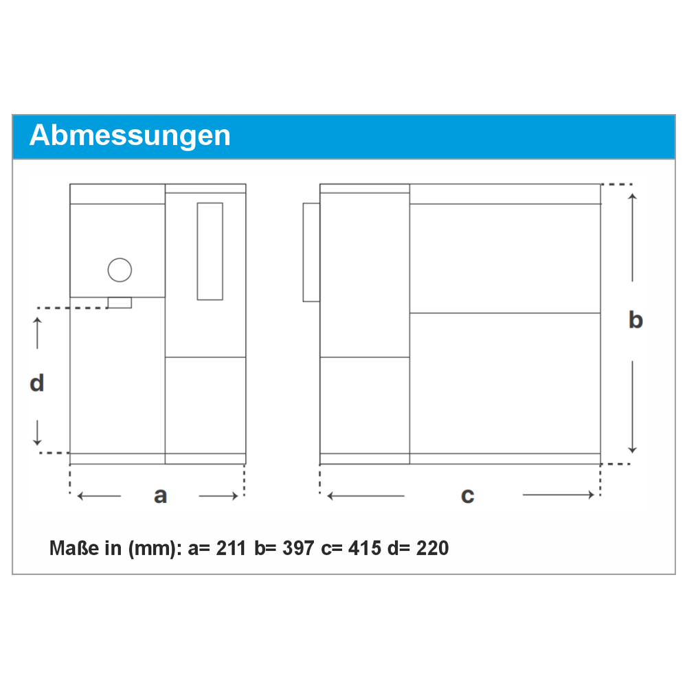 Breite= 21,1 cm Tiefe = 41,5 cm Höhe = 39,7 cm Auslauf = 21 cm